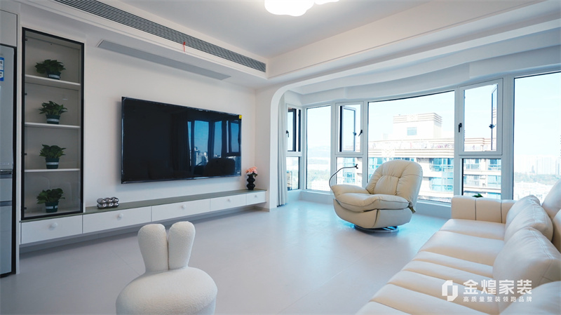 客厅内,大电视直接挂在墙上,下方配以简约的电视柜,旁边摆放着舒适的沙发和别致的休闲椅,没有过多的繁杂装饰,显得宽敞又明亮。大窗户的设计让室内光线充足,进一步增强了空间的通透感。