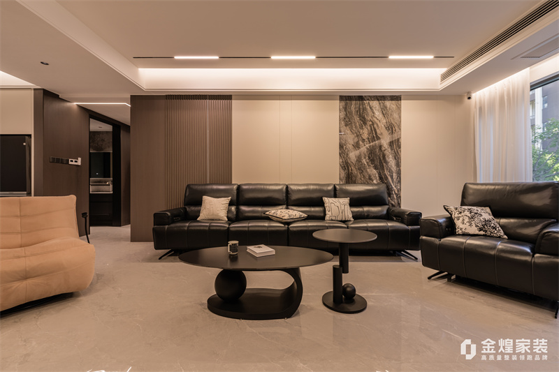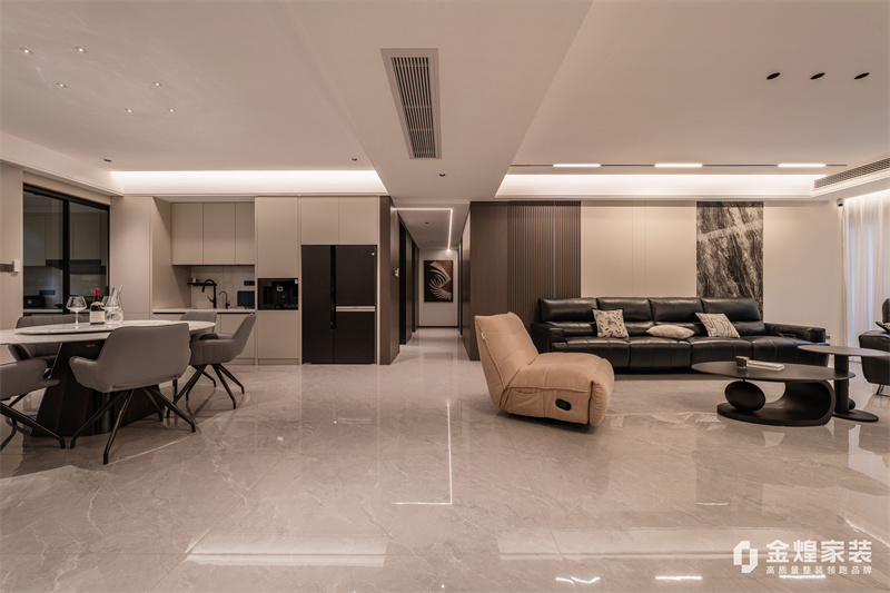 本案整体以意式轻奢为主基调,去客厅化,结合轻奢主义打造意式简约空间,整体运用了木饰面、硬包以及岩板等不同材质的碰撞,空间沉稳大气,质感十足。