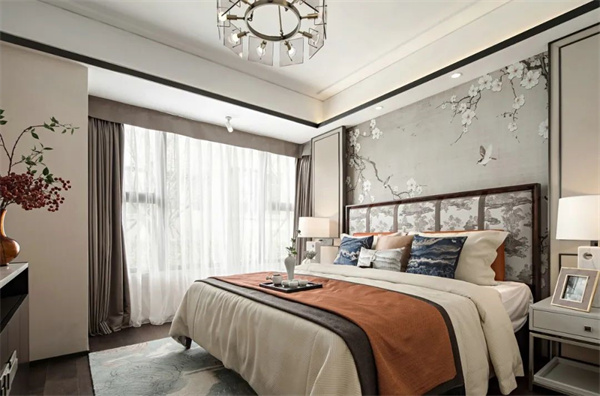 卧室的色彩以柔和、舒适的中性色为主,营造出宁静、放松的氛围。床头做了大块装饰背景,再搭配温馨质感有格调的软装布置,拉开空间的层次感。