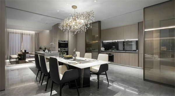 意式轻奢餐厅强调用餐空间的舒适和尊贵感。开放式的设计让光线在餐厅与客厅间自由流动,整个空间视野明亮而通透,完美呈现了意式轻奢的优雅格调与舒适居家体验。