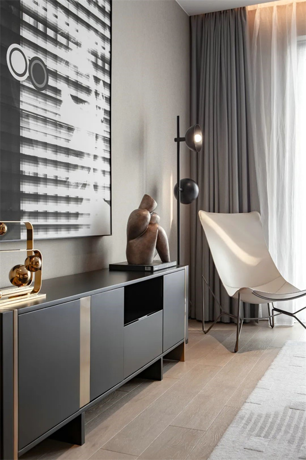 设计师将意大利经典的设计美学与现代简约相结合,通过简洁的线条、柔和的中性色调,精致的材质细节,营造出一种低调却彰显主人品味的奢华感。