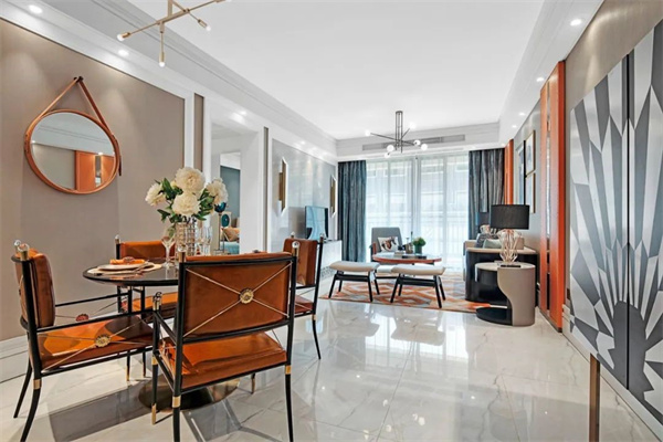 餐厅设计讲究细节与品质的融合。中央的餐桌简洁大气,围绕它摆放着几张极具辨识度的爱马仕橙色餐椅,与同色系的装饰品相互呼应,为餐厅增添了一丝活力和时尚感。餐桌上精致的餐具与花艺装饰,为每一餐的时光都赋予满满的仪式感。
