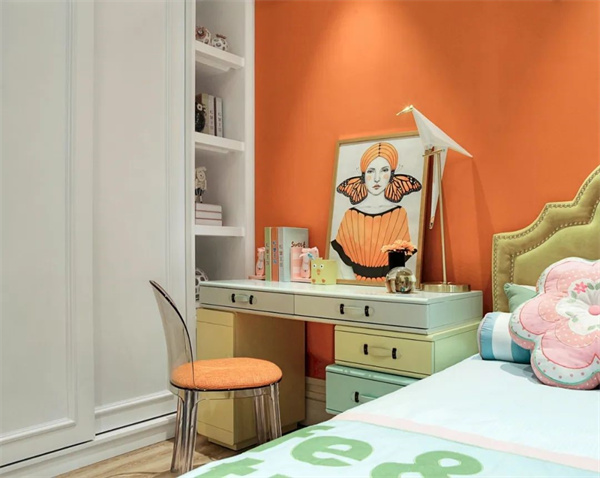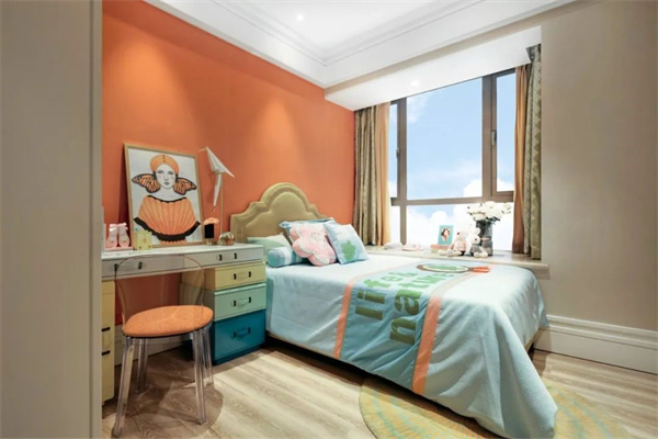 儿童房充满温馨与活力,设计简洁却极具趣味性。房间的主色调以橙色为主,配合原木色地板,营造出轻松愉快的氛围。一侧设置了一张书桌,阳台明亮的光线洒入室内,为孩子提供了理想的学习和游戏区域,增添了童趣和活力。