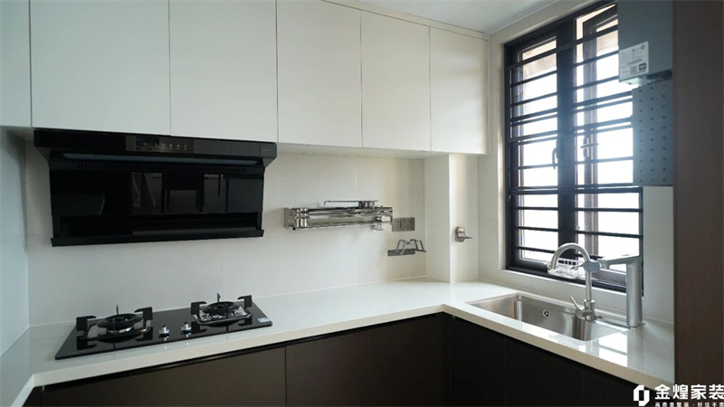 厨房整体采用黑白搭配,营造出整洁利落的视觉效果。U型布局让空间利用率最大化,操作流畅且方便。嵌入式的厨电设计进一步优化了空间,简约的设计不仅让厨房看起来明亮,也提升了烹饪时的舒适感。