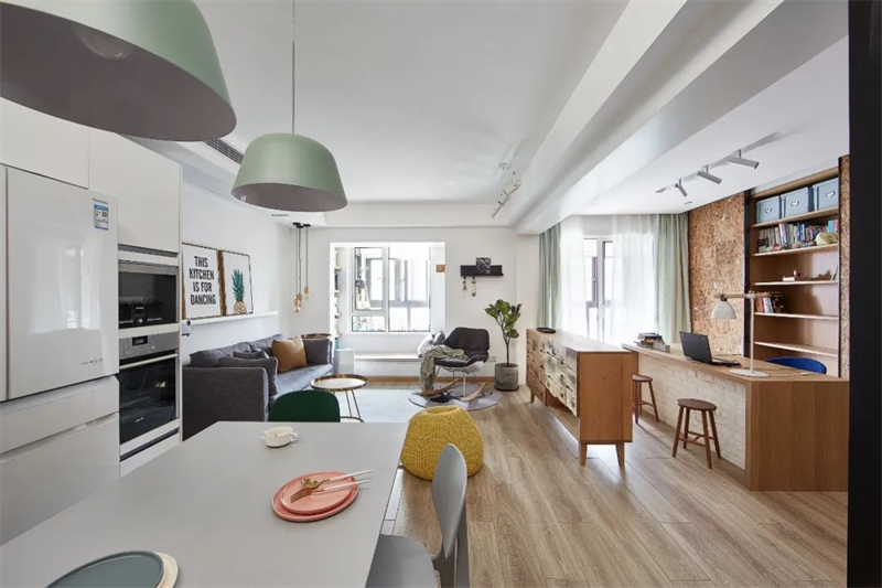 客厅是本案的亮点,白色墙壁为空间提供了明亮的背景。客厅的地板是原木色,赋予了房间自然的温暖感。墙上装饰着一些抽象的艺术画作,为空间带来些许艺术氛围。整个客厅的设计强调了开放感和清晰的线条,让人感到宽敞和时尚。